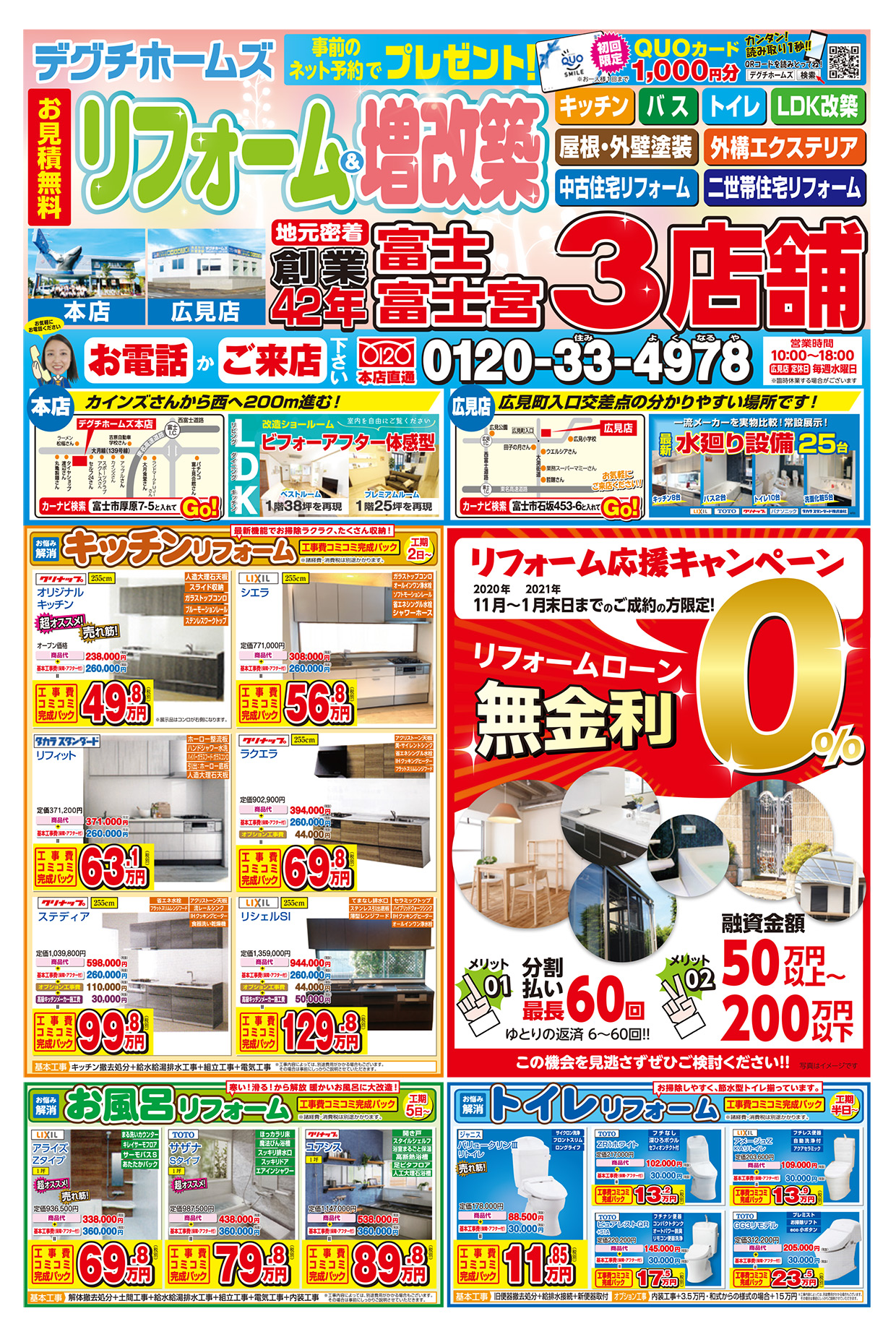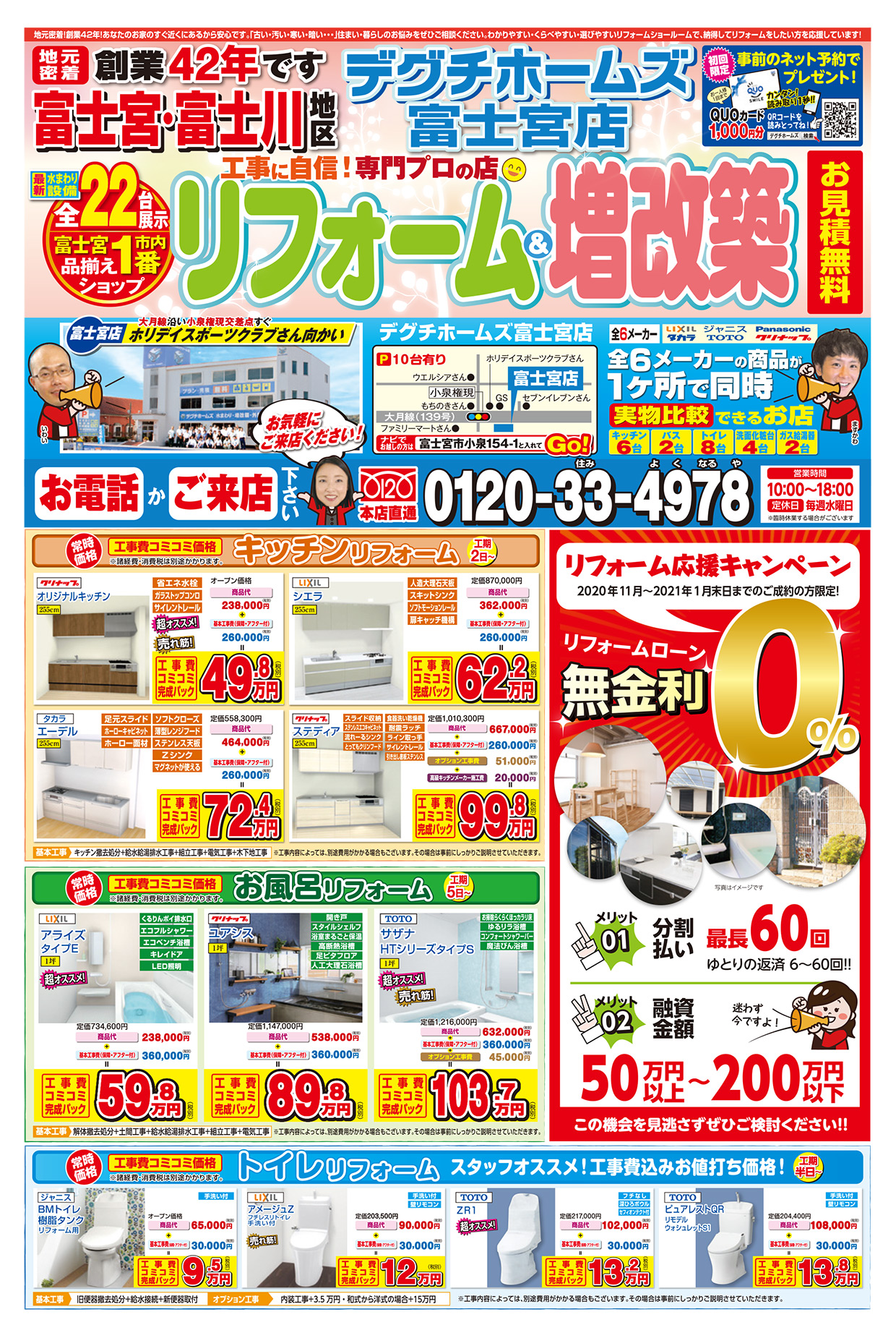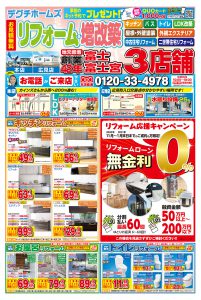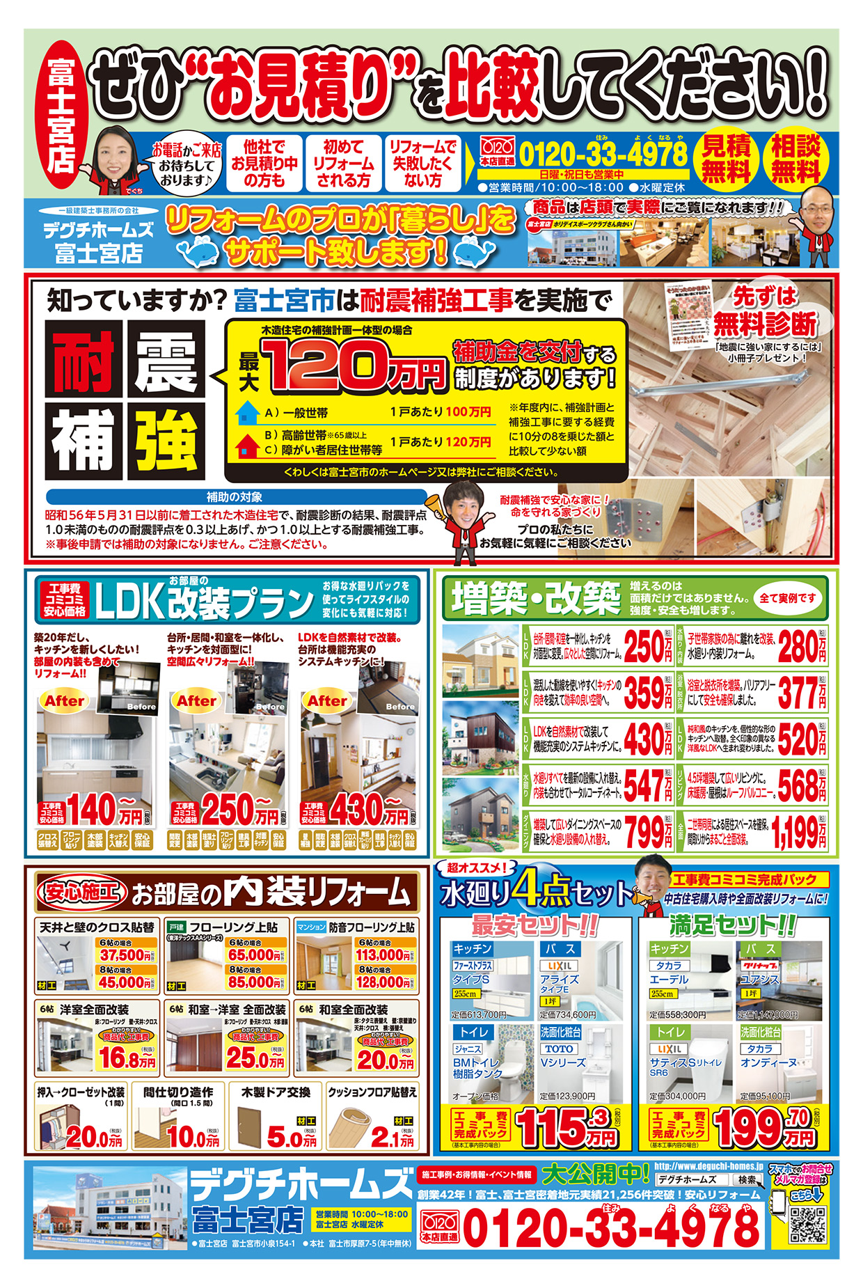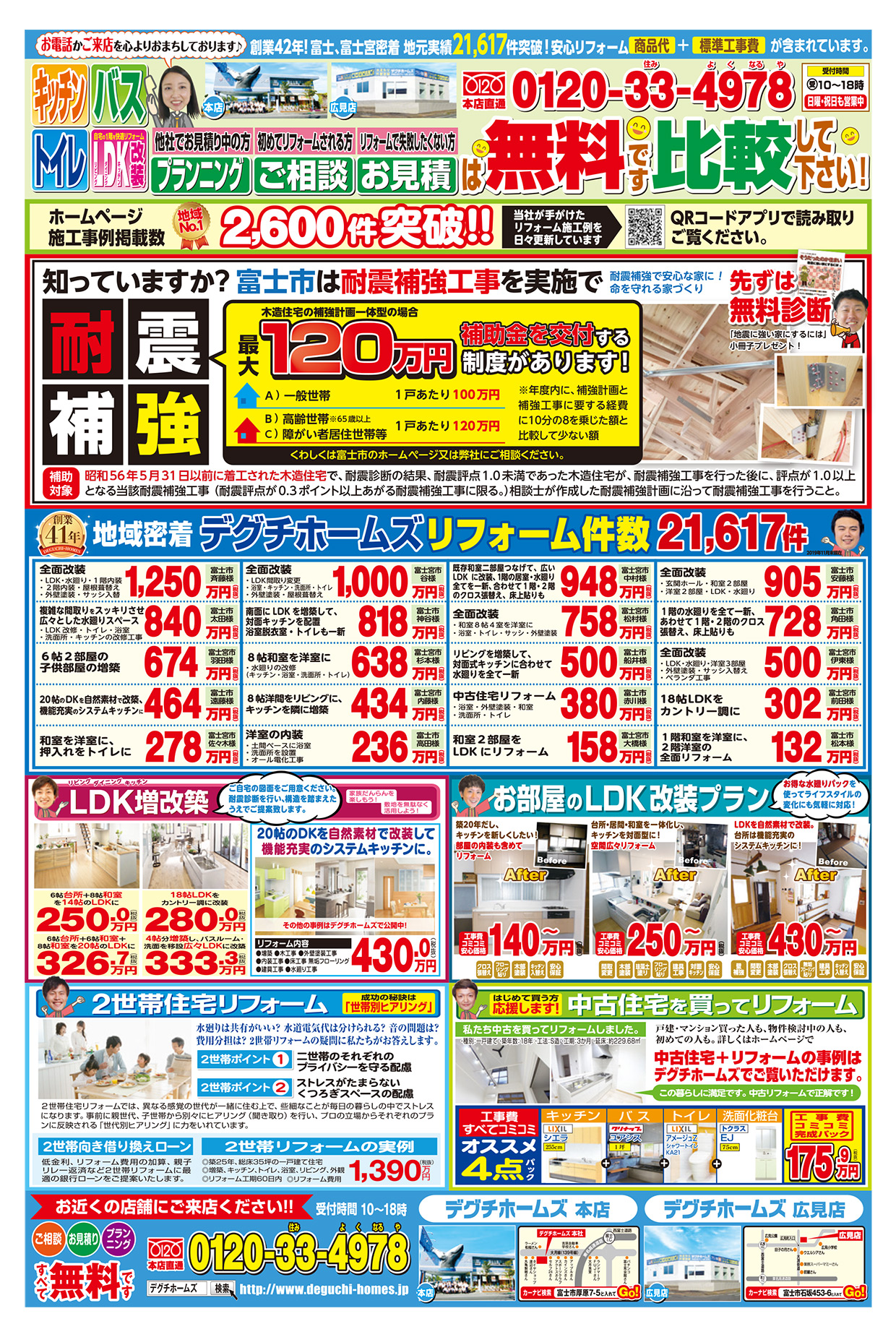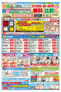 裏面は、富士市・富士宮市の『耐震補強』補助金情報や、様々なリフォーム工事の参考価格を掲載。
