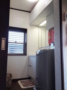 少し狭くなった分、高さや壁厚を有効利用。明るく清潔感のある素敵な洗面室になりました。