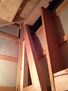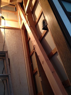 筋交いが入っていない壁をはがし、新しく柱を入れています。