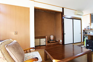 キッチンと和室の間に壁がありましたが、仕切り壁を撤去してLDKにしました。広い空間になり、収納もたくさんできるようになりました。思い入れのある床の間は残して仕上げました。