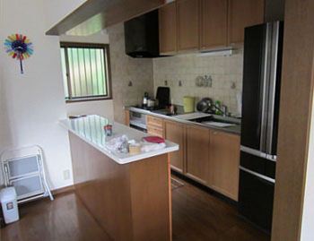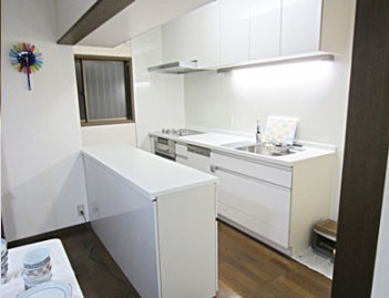 旧式のキッチンから最新のスライド収納式のキッチンへ交換しました。また、以前から気になっていた薄暗さも、木目柄からホワイトへ一新。前面パネルも白に合わせ、スッキリ明るいキッチンへ生まれ変わりました。