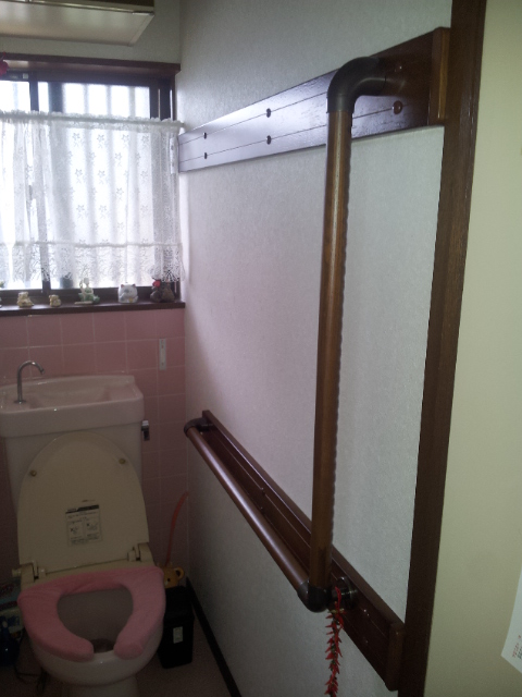 おばあちゃんがおトイレの立ち座りが大変と言うことで 手摺り取り付け工事をさせてもらいました。 壁が石膏ボードのため直接壁に手摺りを取り付けすることができませんでした。 なので、ベース材を先に壁に取り付けをして、 ベース材に手摺りを取り付けしました。