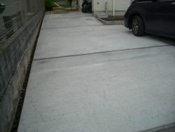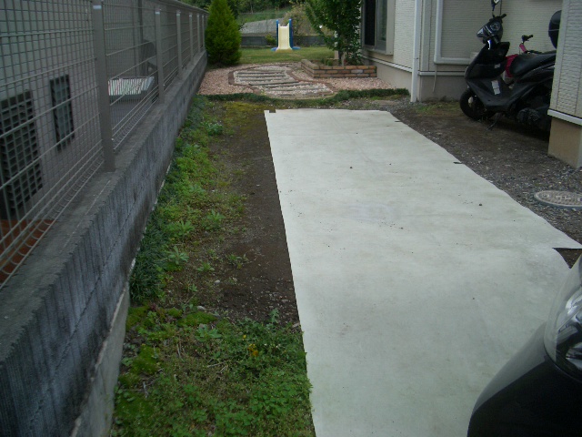 駐車スペースと玄関にかけてのアプローチをコンクリート敷きにし、勝手口の前はブロックで仕切りました。駐車スペースの右側と勝手口の前のスペースはあえてコンクリートを敷きませんでした。休みの日にご主人様が少しずつ芝を植えていくそうです。
