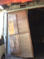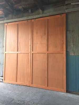 かなり老朽していた扉でしたが風が強い日に 飛んでしまい閉められなくなってしまいました。 工場なので商品が入っており早急に扉を直して欲しいとのご依頼でした。 アルミやスチールでやれば強度が増し良いのですが 工期が掛かる上に下地から補修をし、大規模な工事になるため お客様の予算帯と合わないため木製で新しく作りました。 塗装をして雨にも強くしお客様もすぐに作ることが出来ましたので とても満足して頂けました。