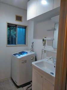 浴室は、土台・壁の腐食がかなり進んでおりましたが、何とか補修し、システムバスを設置する事が出来ました。とても快適です!とお喜びのコメントをいただきました。洗面所は、水漏れのせいで所構わず配管が走っておりましたが、この機会に整理し見た目スッキリになりました。